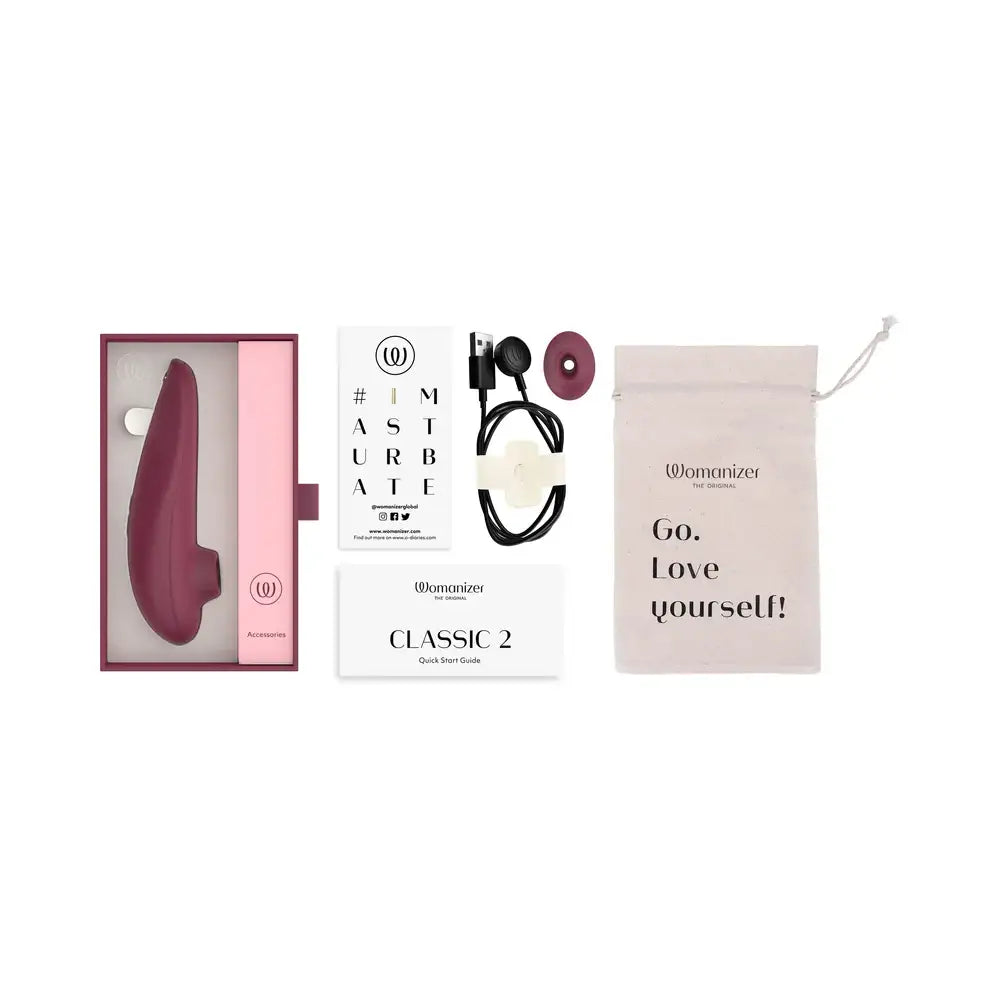 Womanizer CLASSIC 2, USB charging cable (AC adaptor not included), additional stimulation head, quick start guide, safety instructions, cotton storage pouch.