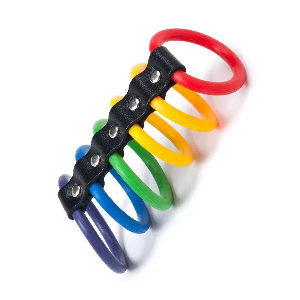 Pride isn't just for flags. With this festive-looking chastity device, you can put the rainbow on your favorite penis and make your play a little bit more flamboyant. Designed and assembled in Stockroom's own workshop, the six silicone rings connected by a leather strap comfortably restrict the shaft until you're ready to release it. Even the darkest dungeon will be brightened by the colors. Perfect for the sub who's proud of his service to you and wants everyone to know it. The rings get progressively smaller, confining the penis.