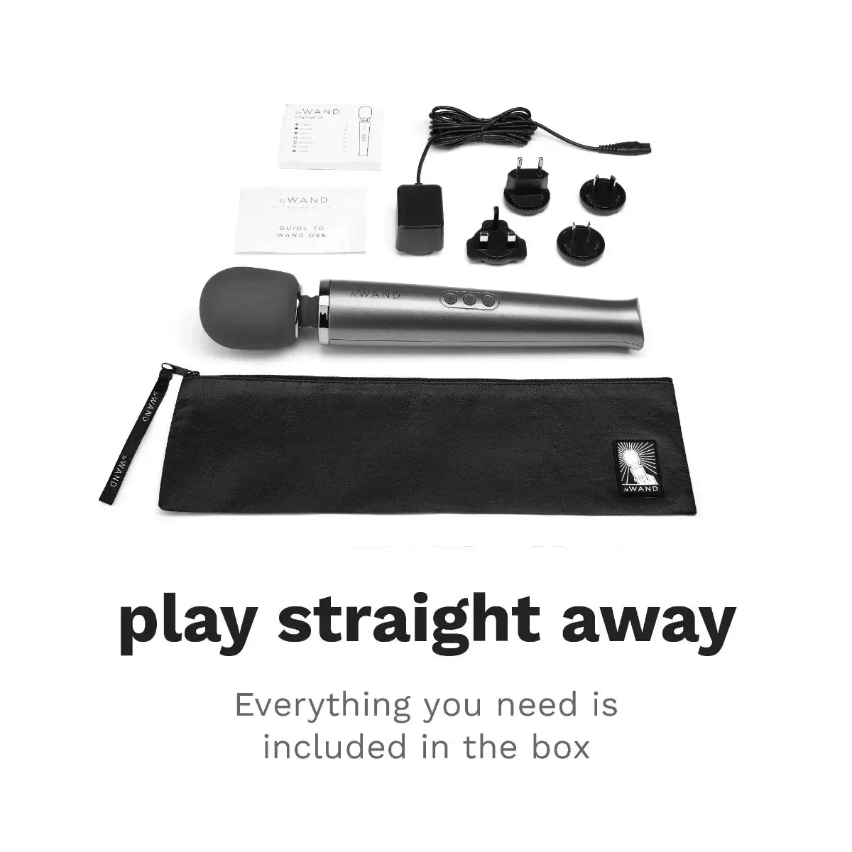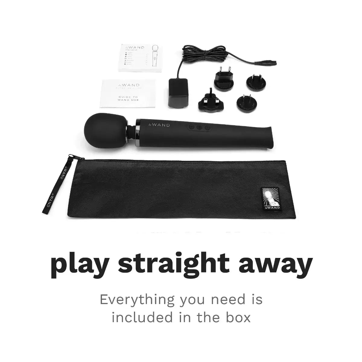 Le Wand Massager, Storage Case, Charging Cable, Universal Plug Adapters, Le Wand Guide to Wand Use, User Guide