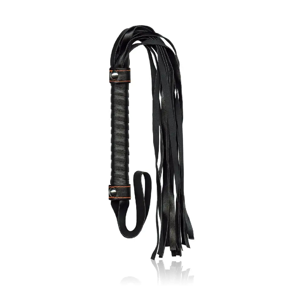Wonderfully-sized flogger with leather-like strands and strong, sturdy handle. Sexy orange-stitched accents add a touch of fashion and intrigue...and there's even a handy strap for easy carrying.